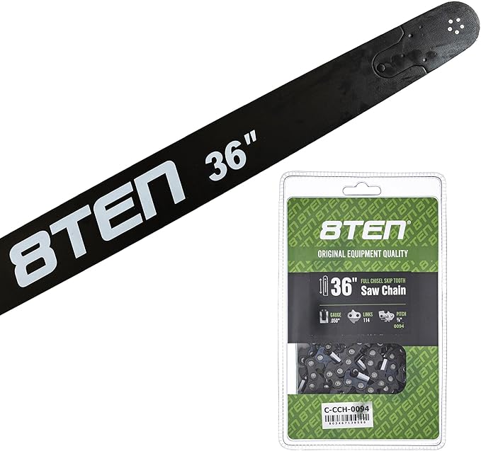 The 8TEN guide bar features a 36-inch cutting length that supports extensive milling applications. Its 050-inch gauge and 3/8-inch pitch chain design allow smooth operation while maintaining sharpness over time.