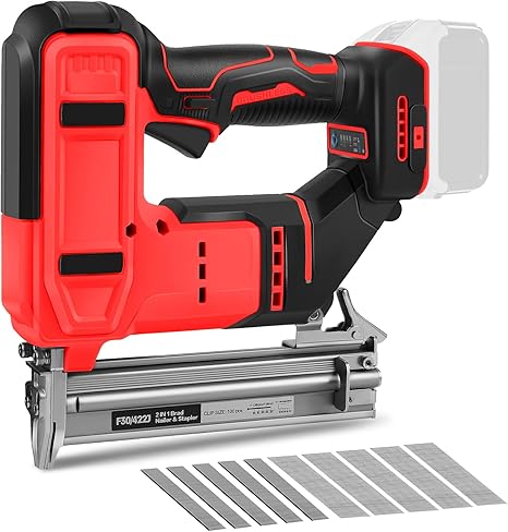 The Cordless Brad Nailer operates with a high-performance brushless motor, improving runtime and reducing the risk of overheating. This design enhances durability while maintaining steady power for driving nails and staples. A safety self-locking switch near the trigger prevents accidental firing, adding a layer of security during use.